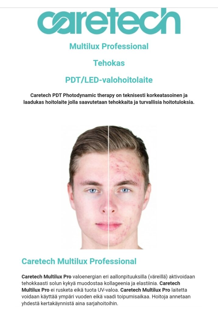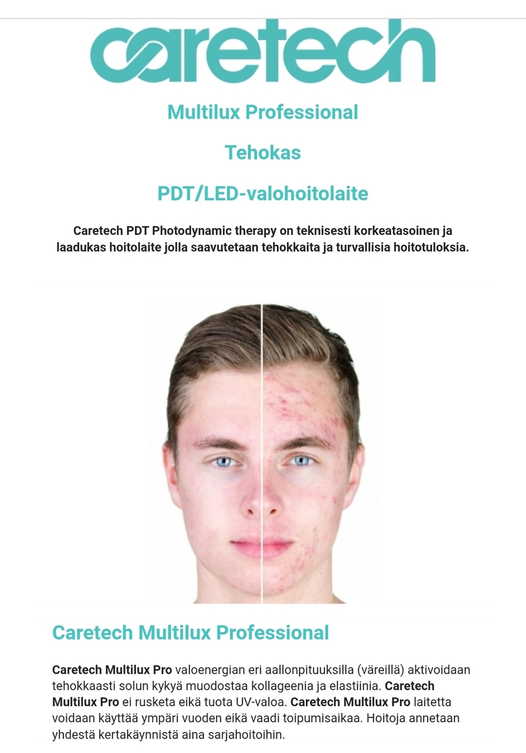 Caretech PDT photodynamic therapy laite on nopea tapa hoitaa ja uudistaa ihoa. Ledhoito ei polta eikä rusketa ihoa. Led ei tuota UV-säteitä. Hoidon kesto 5-20min.