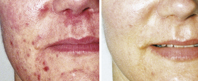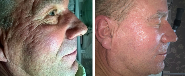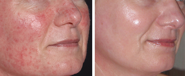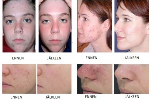Acne rosacea (ruusufinni) – lähtötilanne ja hoitotulos (hapotukset hoitolassa + kotihoitotuotteet) 6kk jälkeen.