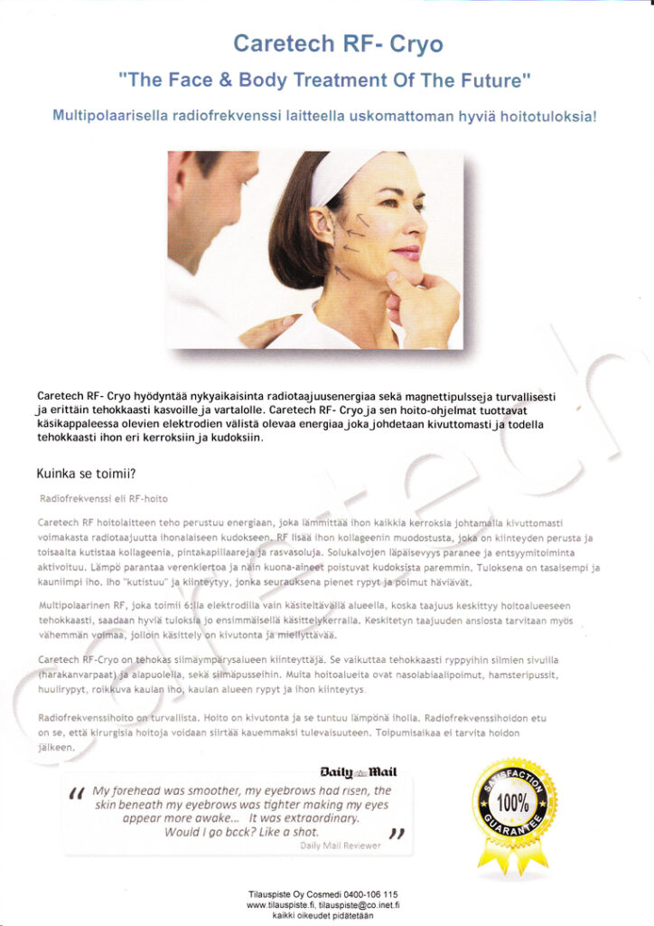 Caretech RF hoitolaitteen teho perustuu radiotaajuusenergiaan ja magnettipulsseihin,mitkä lämmittävät ihon kaikkia kerroksia kivuttomasti. Tämä saa aikaan kollageenin muodostumista, mikä on kiinteyden perusta, samalla kutistaen kollageenia, pintakapillaareja ja rasvasoluja. Lämpö parantaa verenkiertoa poistaen kuona-aineita. Iho ”kutistuu” ja kiinteytyy!