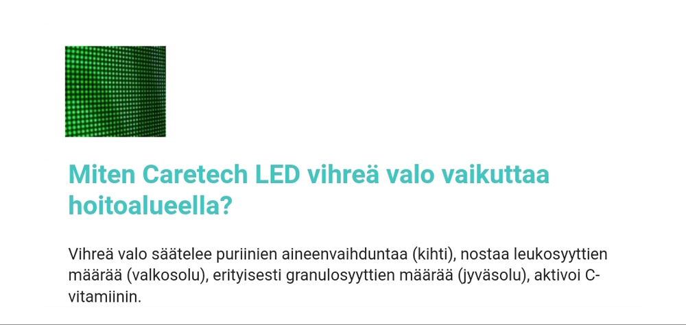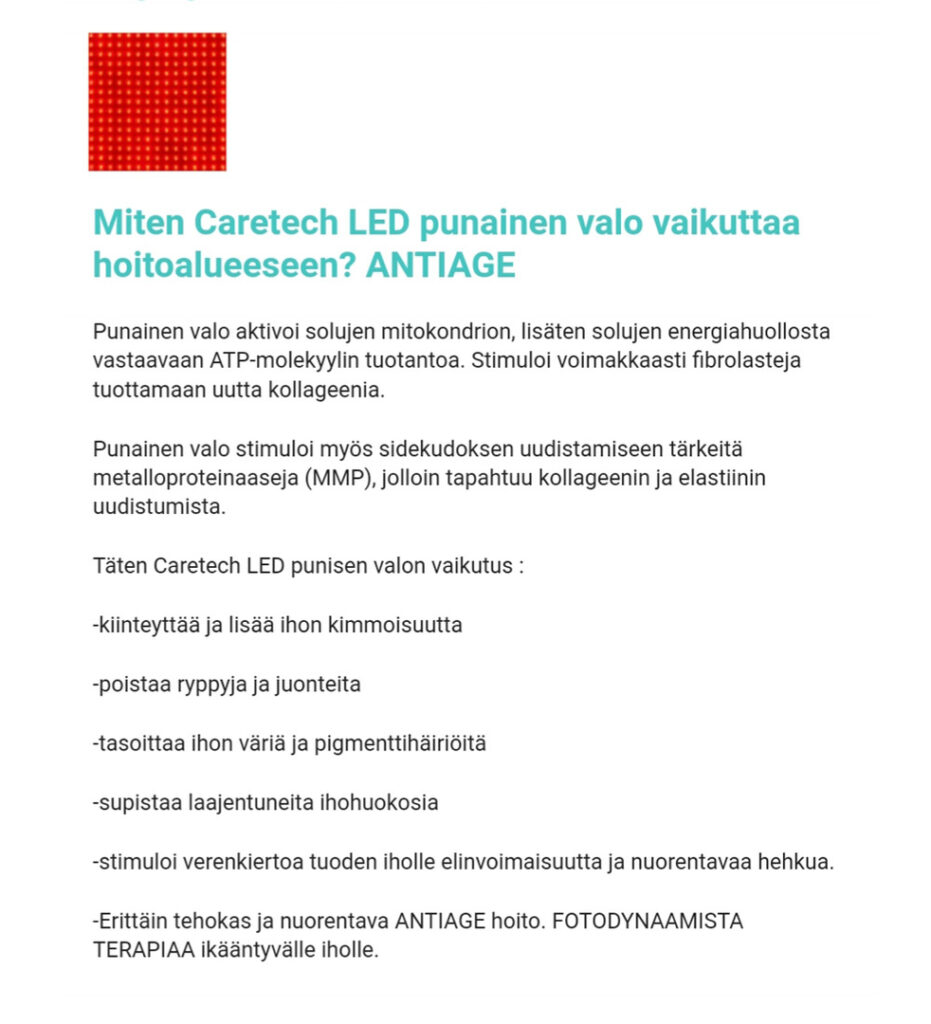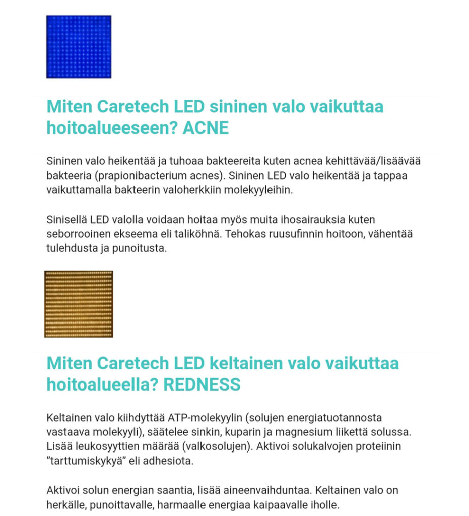 Led valohoito voidaan yhdistää tehostamaan myös muita hoitoja.Caretech Led hoidossa fotonien avulla stimuloidaan ihosoluja, jolloin valoenergia siirtyy iholla soluenergiaksi.