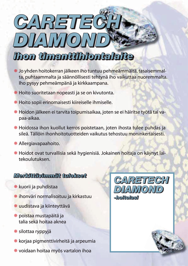 Timanttihionnassa pienellä alipaineimulla ja timanttihoitopäällä iholta poistetaan turvallisesti, mutta tehokkaasti kuollutta ihosolukkoa,talia ja mustapäitä. Iho on hoidon jälkeen pehmeämpi, kirkkaampi ja hoitoaineiden imeytyvyys paranee.