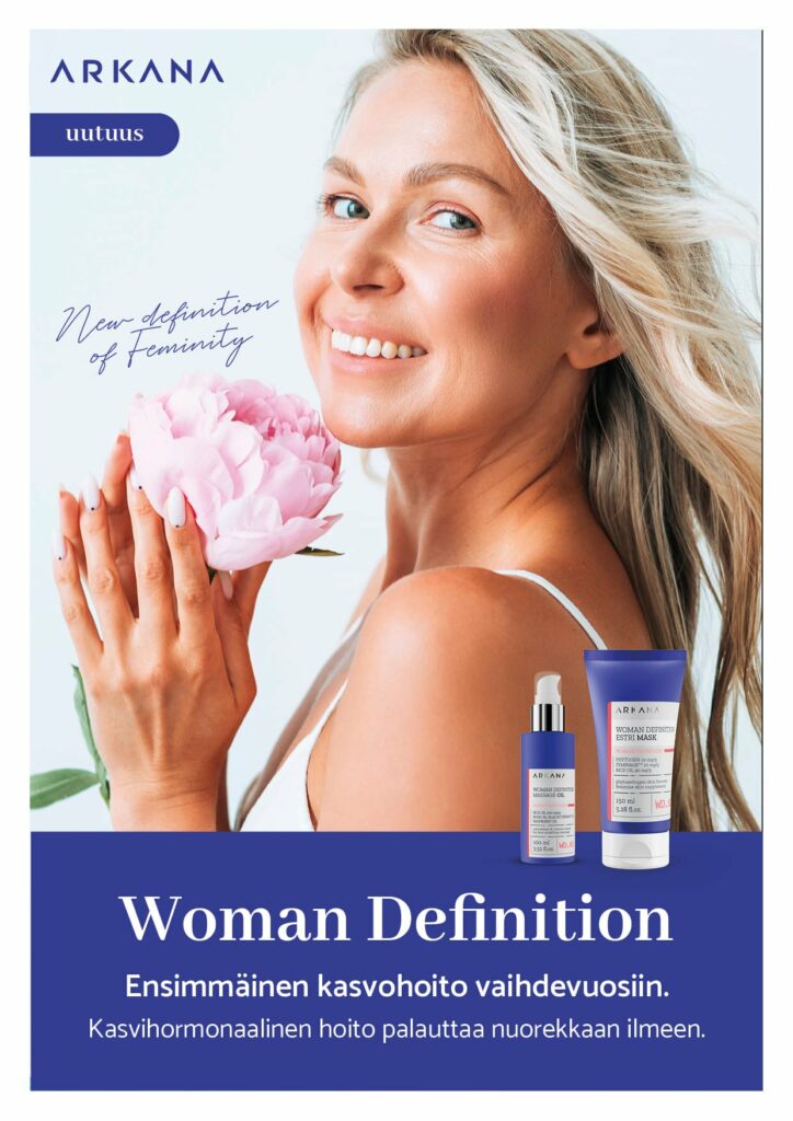 WOMAN DEFINITION, vaihdevuosien eli estrogeenin vähenemisen mukanaan tuomien ihomuutosten ennaltaehkäisyyn ja korjaamiseen!